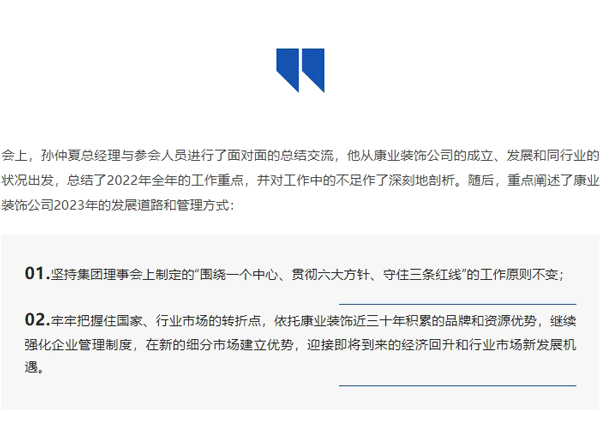 康業(yè)裝飾丨2022年(nián)度工(gōng)作(zuò)總結暨2023年(nián)度✔&&ε工(gōng)作(zuò)安排會(huì)議(yì)順利召開(kāi)